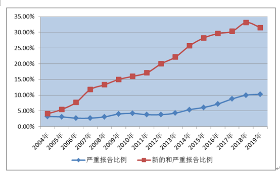 圖2 2004年-2019年新的和嚴(yán)重以及嚴(yán)重藥品不良反應(yīng)/事件報(bào)告比例