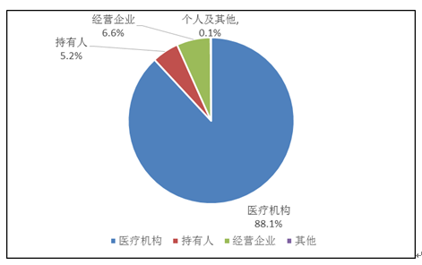 持有人、經(jīng)營(yíng)企業(yè)和醫(yī)療機(jī)構(gòu)是藥品不良反應(yīng)報(bào)告的責(zé)任單位。按照?qǐng)?bào)告來(lái)源統(tǒng)計(jì),2019年來(lái)自醫(yī)療機(jī)構(gòu)的報(bào)告占88.1%;來(lái)自經(jīng)營(yíng)企業(yè)的報(bào)告占6.6%;來(lái)自持有人的報(bào)告占5.2%;來(lái)自個(gè)人及其他報(bào)告者的報(bào)告占0.1%(圖3)。