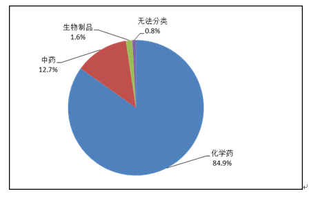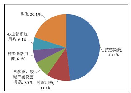 按照藥品類別統(tǒng)計(jì),化學(xué)藥品占86.6%,中藥占12.6%,生物制品占0.8%?;瘜W(xué)藥品排名居前的藥品類別是抗感染藥、心血管系統(tǒng)用藥、腫瘤用藥、神經(jīng)系統(tǒng)用藥、電解質(zhì)、酸堿平衡及營(yíng)養(yǎng)藥;中藥排名居前的藥品類別是理血?jiǎng)?、補(bǔ)益劑、祛濕劑、開(kāi)竅劑、清熱劑。